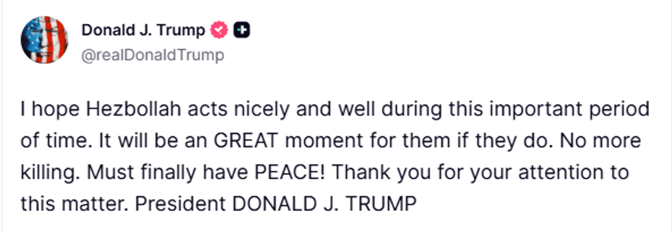 “I hope Hezbollah acts nicely and well during this important period of time. It will be a great moment for them if they do. No more killing. Must finally have peace,” Trump said on his Truth Social platform.