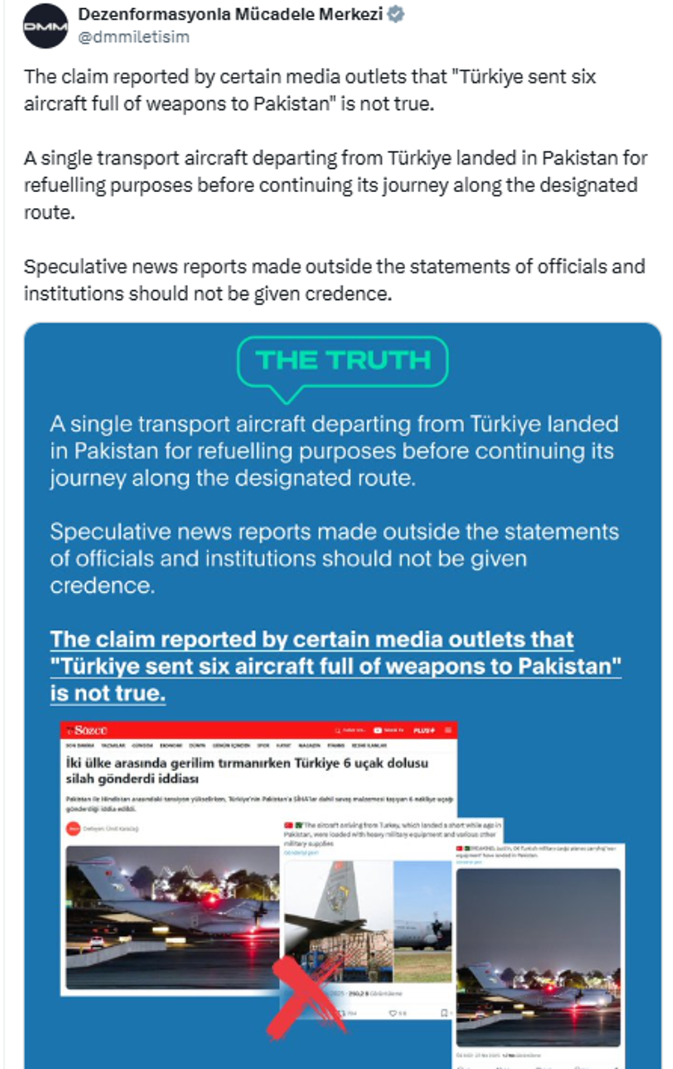 In a post on X, its Center for Countering Disinformation said: “A cargo plane departing from Türkiye made a refueling stop in Pakistan before continuing on its designated route. Speculative reports not based on statements from official authorities should be disregarded.”