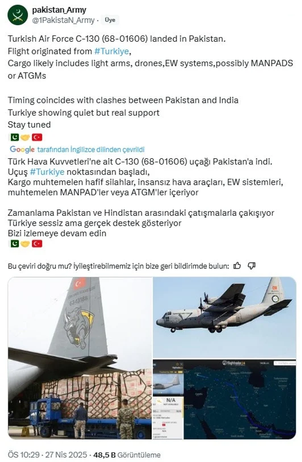 The 'false claim' originated from a now-deleted fake account on X, @1PakistaN_Army, which on April 27 alleged that a Turkish C-130 aircraft had delivered military cargo -- ranging from light arms to drones and missile systems -- to Pakistan.