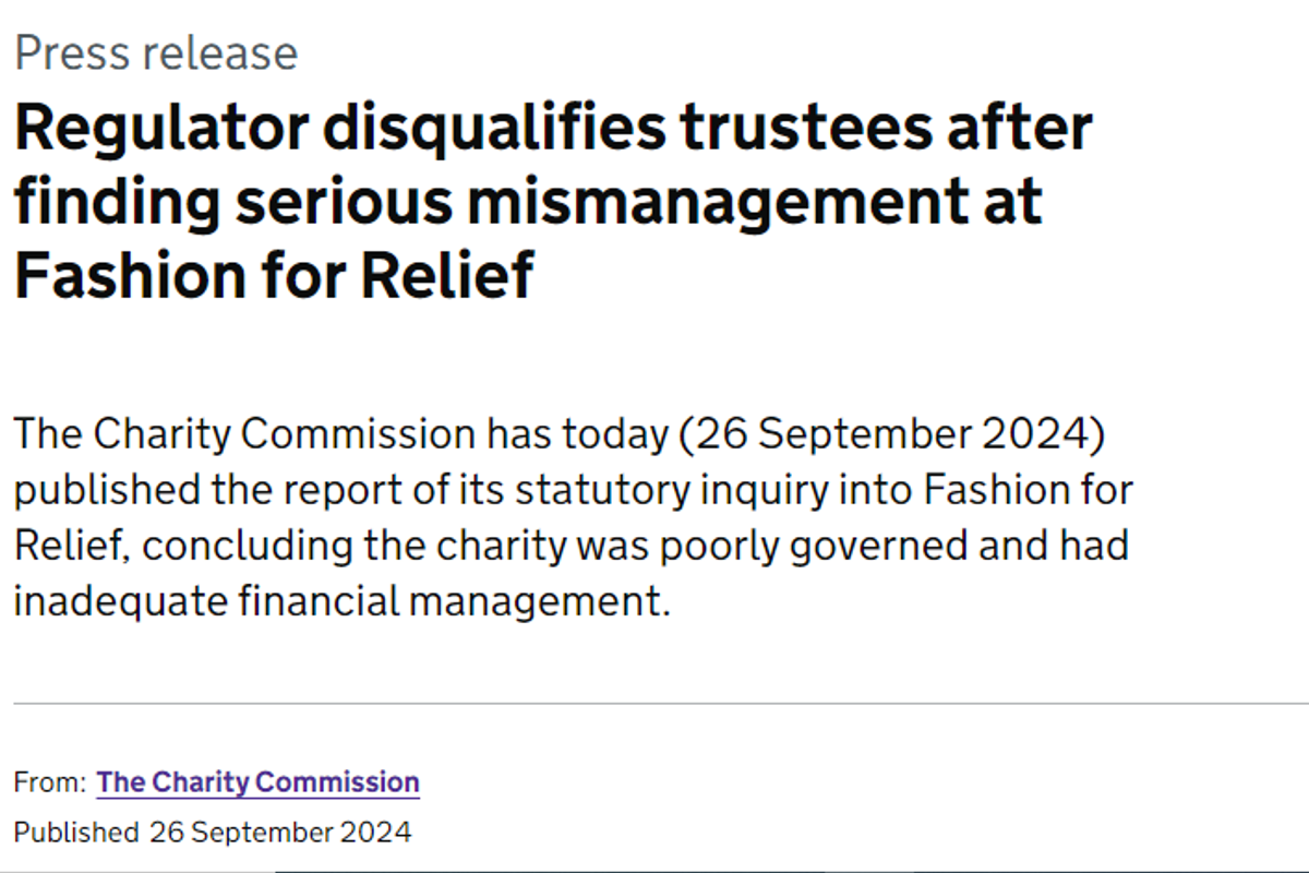 The regulator recovered over 400,000 pounds from Fashion For Relief, which has been used to settle its outstanding liabilities with the balance directed to other charities.