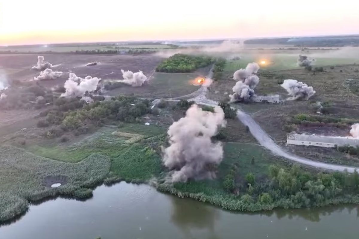 A drone view shows what the 68th Separate Jaeger Brigade 'Oleksy Dovbusha' says are multiple launch rocket system strikes on Russian troops, in Novozhelanne, Donetsk Region, Ukraine, in this still image from handout video obtained on August 21, 2024