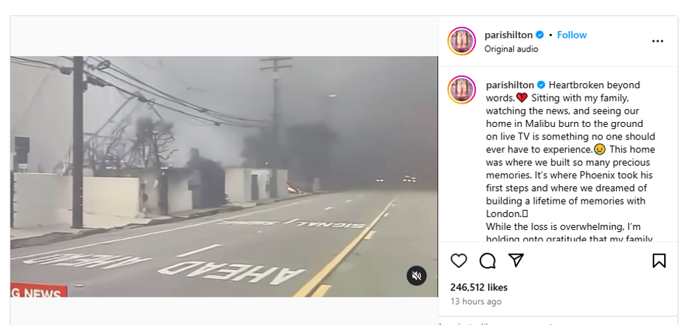 Media personality Paris Hilton said she was “heartbroken beyond words” after watching her beachfront house in Malibu “burn to the ground on live TV.”