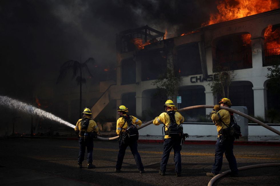 Firefighters battle the Palisades Fire as it burns during a windstorm on the west side of Los Angeles, California, U.S. January 8, 2025.