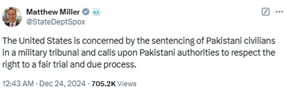 "The United States is deeply concerned that Pakistani civilians have been sentenced by a military tribunal for their involvement in protests on May 9, 2023," State Department spokesperson Matthew Miller said in a statement Tuesday. "These military courts lack judicial independence, transparency, and due process guarantees," he added.