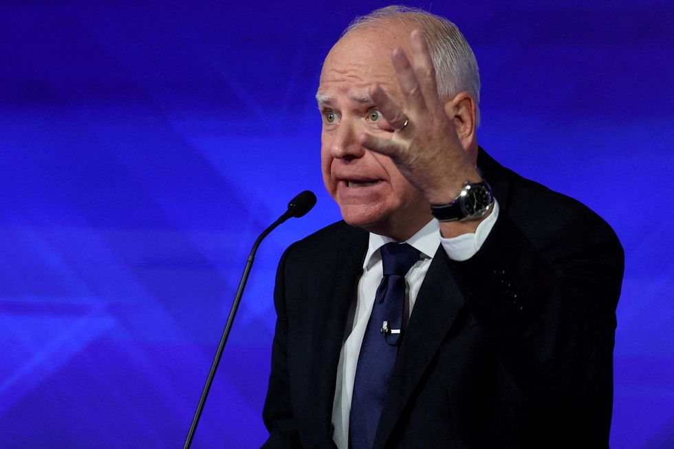 Democratic vice presidential nominee Minnesota Governor Tim Walz gestures as he speaks during a debate with Republican vice presidential nominee U.S. Senator JD Vance (R-OH) hosted by CBS in New York, U.S., October 1, 2024.
