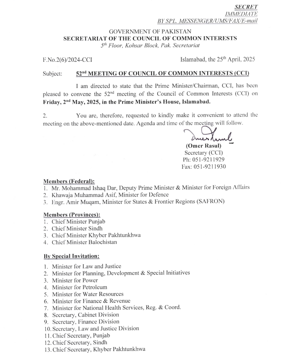 While all council members have been informed, the exact time remains to be announced. The central focus will be addressing the controversial canal projects, with officials working to build consensus particularly between Punjab and Sindh provinces.