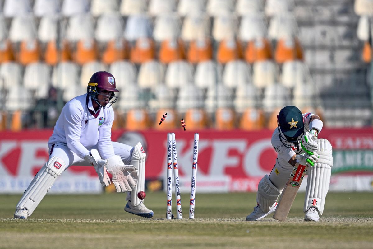 Pakistan's Mohammad Rizwan (R) is clean bowled during the third day of the second Test cricket match between Pakistan and West Indies at the Multan Cricket Stadium in Multan on January 27, 2025.
