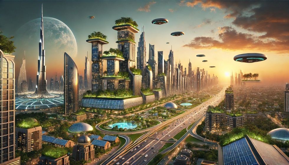 Landmarks like the Burj Khalifa 2.0 incorporate AI-driven climate control and energy efficiency. Al Wasl Dome evolves into a hub for global AI innovations, hosting holographic conferences attended by leaders from across the metaverse.