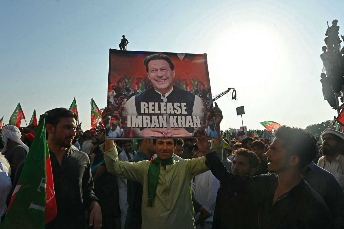 Activists of Pakistan Tehreek-e-Insaf (PTI), party of former country’s prime minister Imran Khan, hold a moustache-shaped placard during a public rally on the outskirts of Islamabad on September 8, 2024.