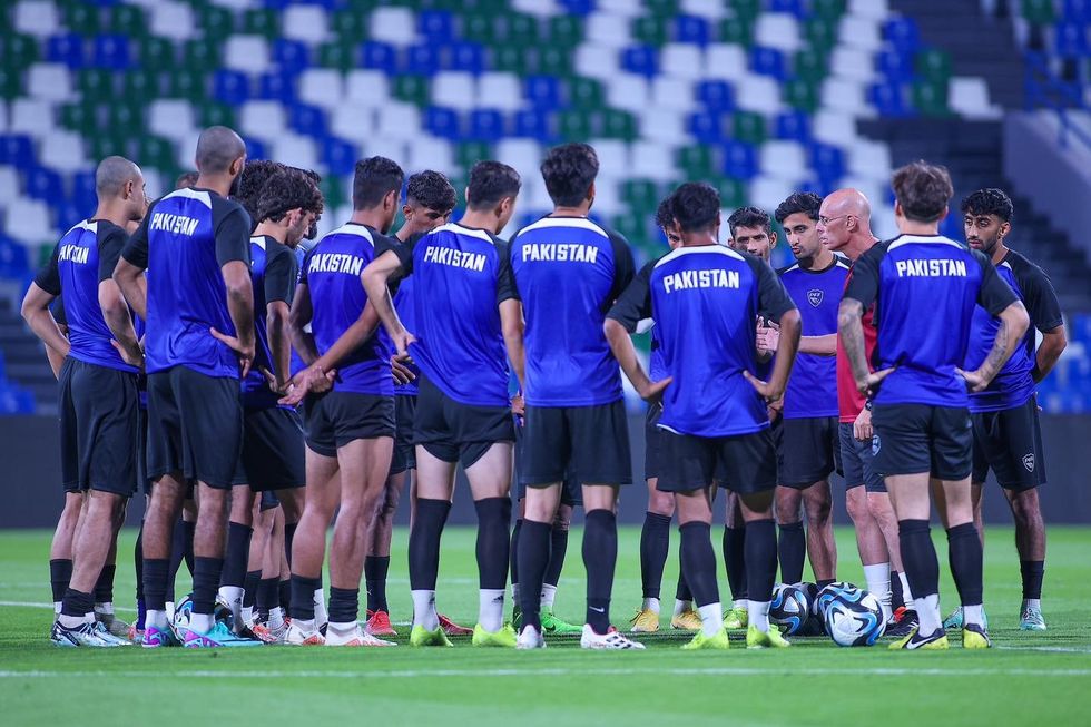 Pakistan men's football team stands for the national anthem before a match.