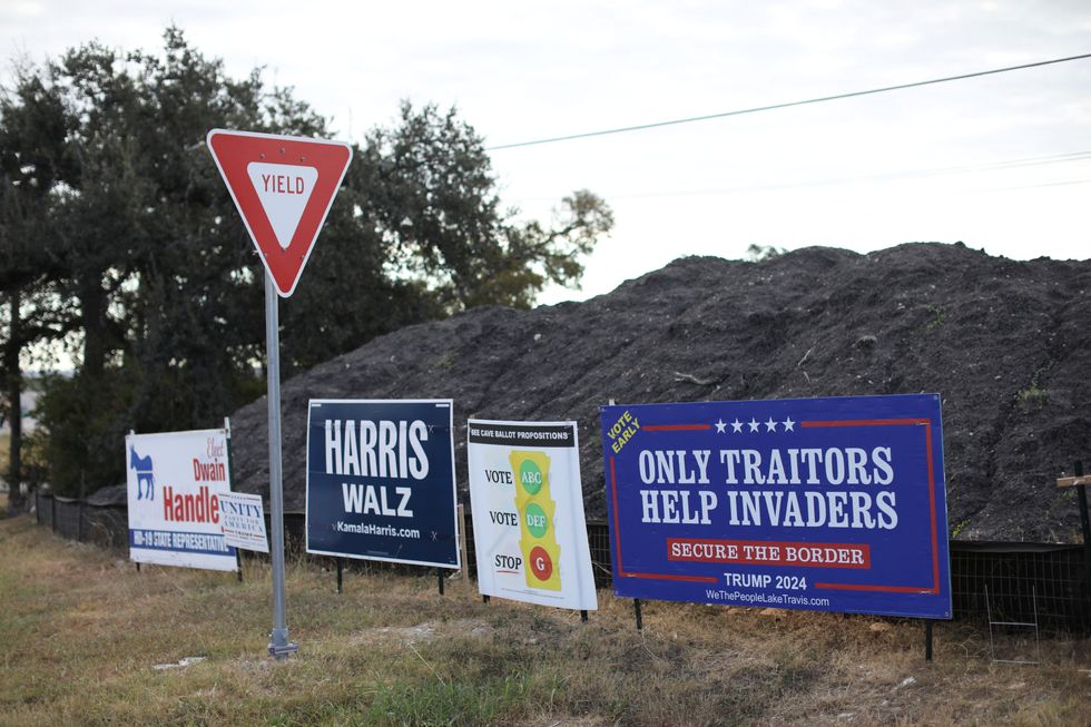 Images of U.S. Presidential candidates, Former U.S. President Donald Trump and U.S. Vice President Kamala Harris are displayed before Trump's rally at the Madison Square Garden in New York City, U.S., October 26, 2024.