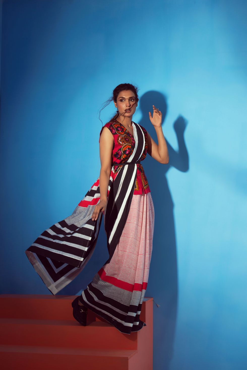 Style twist: Layering two different kinds of tops, and draping the sari like a dress.
