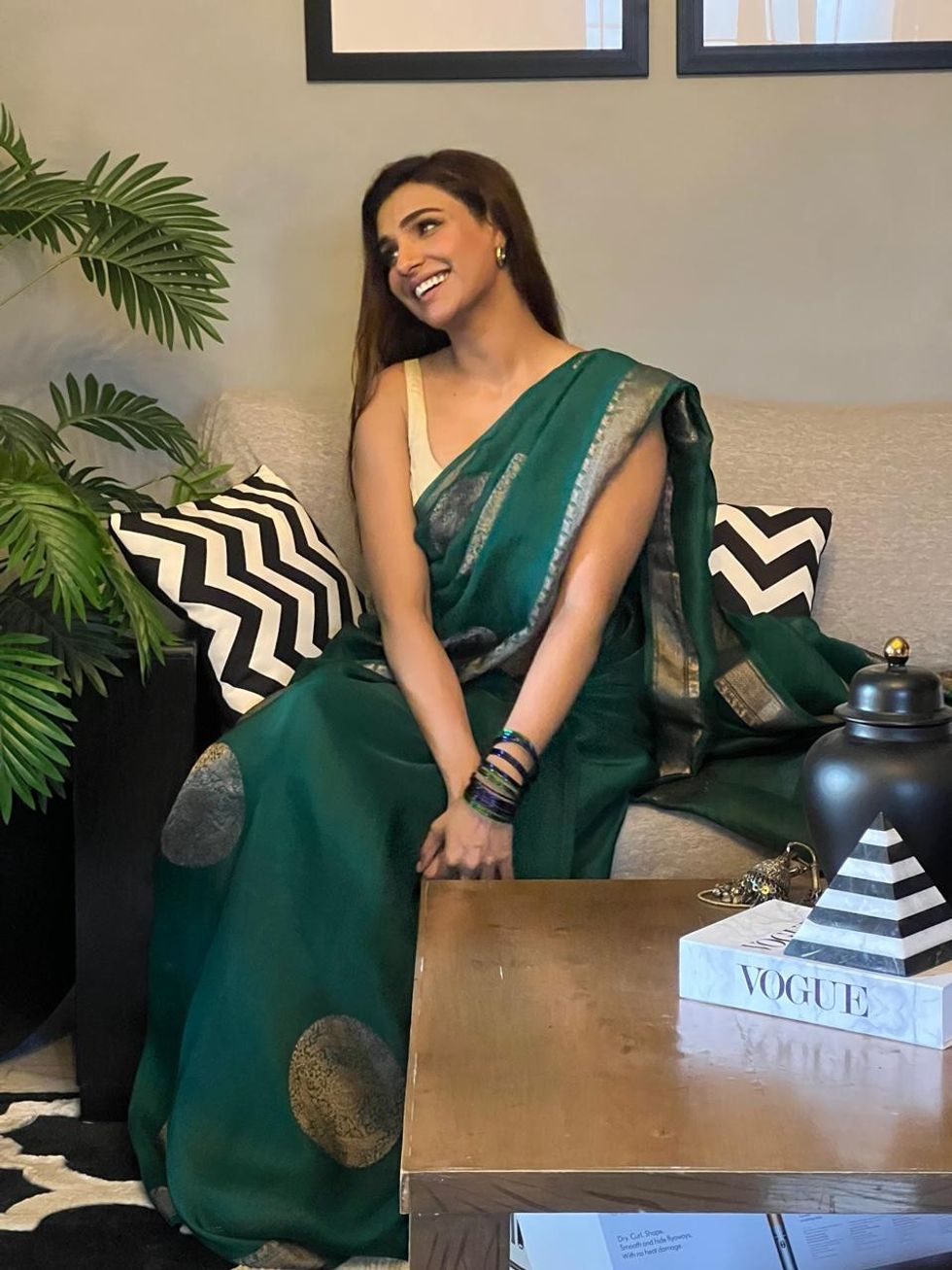 "Saris can be draped in multiple ways, are easy to wear, and interesting and challenging to style. Plus, Amna is quite comfortable in saris and carries them well which was also kept in mind," explains Ansari.