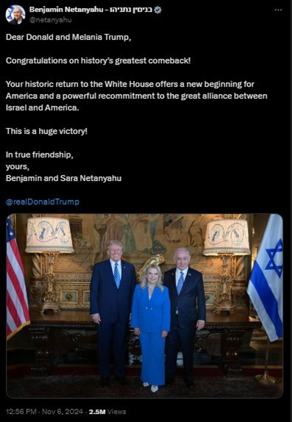 "Congratulations on history's greatest comeback! Your historic return to the White House offers a new beginning for America and a powerful recommitment to the great alliance between Israel and America. This is a huge victory! In true friendship," Netanyahu wrote on X.