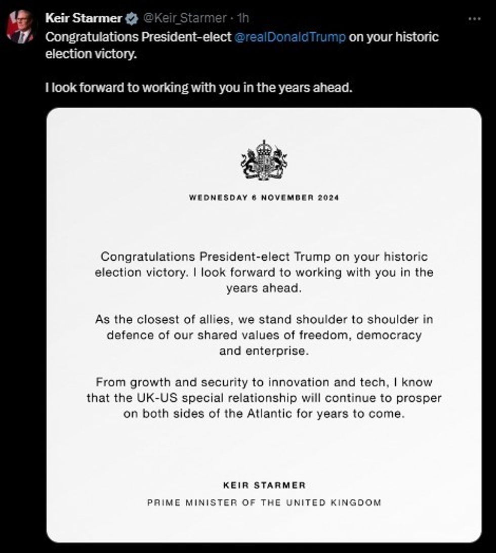 "I look forward to working with you in the years ahead," Starmer said on X on Wednesday.