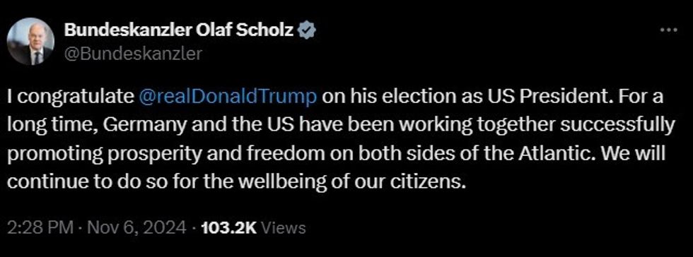 "Germany and the U.S. have for a long time successfully worked together to promote prosperity and freedom on both sides of the Atlantic. We will continue to do so for the benefit of our citizens," Scholz posted on X.