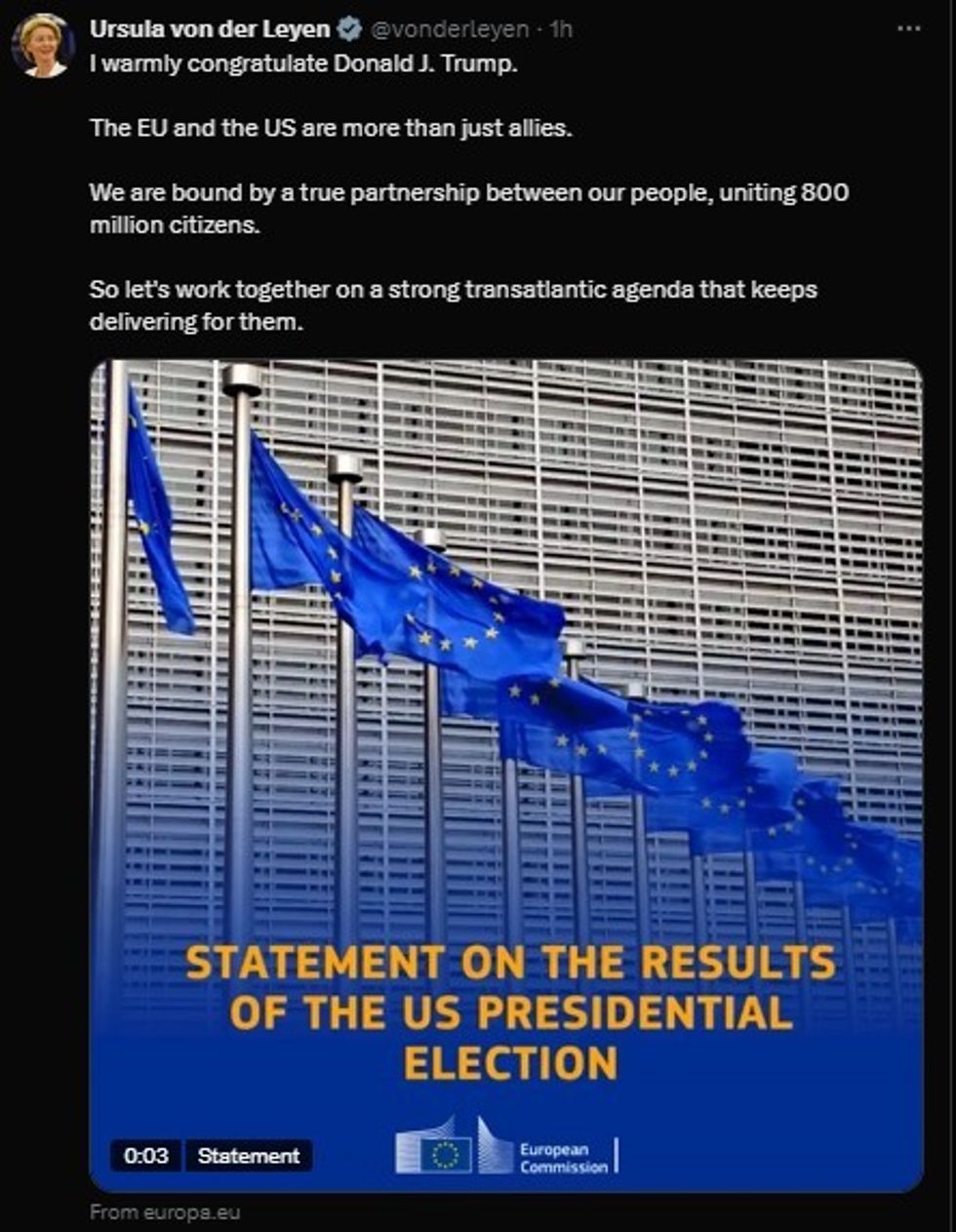 "I warmly congratulate Donald J. Trump on his election as the 47th President of the United States of America. I look forward to working with President Trump again to advance a strong transatlantic agenda