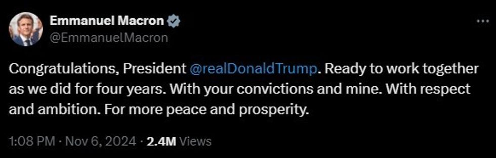 "Congratulations, President Donald Trump. Ready to work together just as we knew how to do during four years. With your convictions and with mine. With respect and ambition. For more peace and prosperity," Macron wrote on X.