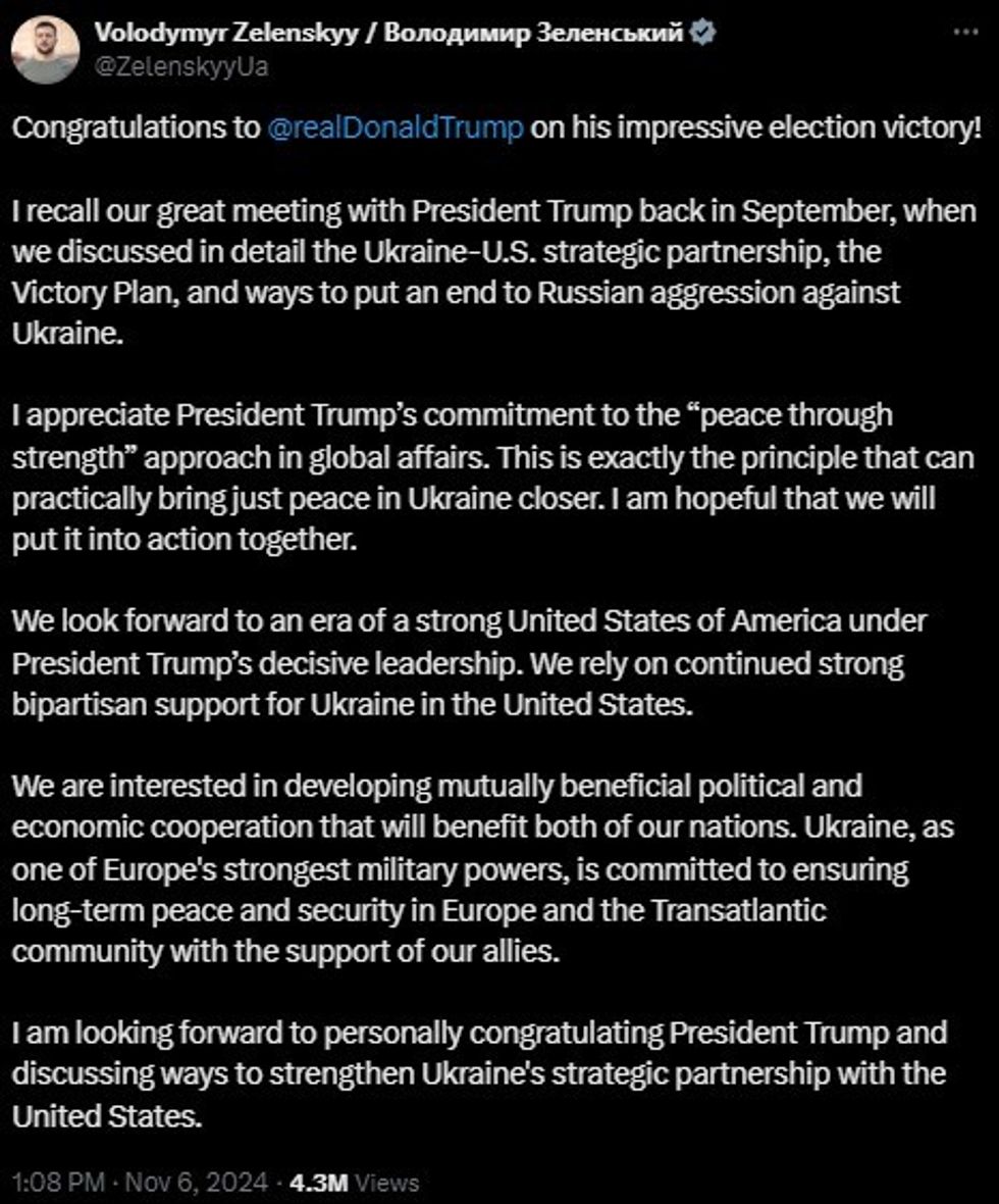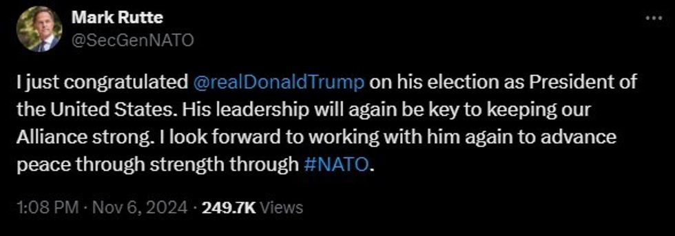 "I just congratulated Donald Trump on his election as President of the United States. His leadership will again be key to keeping our Alliance strong. I look forward to working with him again to advance peace through strength through NATO," Rutte said in a post on X.