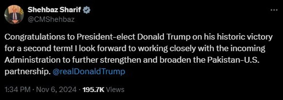 “Congratulations to President-elect Donald Trump on his historic victory for a second term! I look forward to working closely with the incoming Administration to further strengthen and broaden the Pakistan-U.S. partnership. @realDonaldTrump,” Sharif wrote on X.