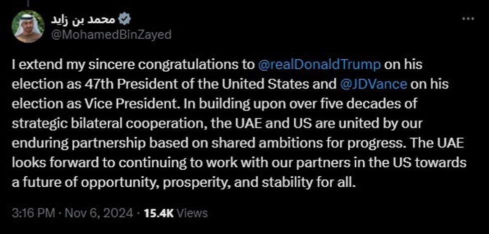 UAE President Sheikh Mohamed bin Zayed Al Nahyan congratulated Trump, emphasizing the longstanding strategic relationship between the UAE and the United States.