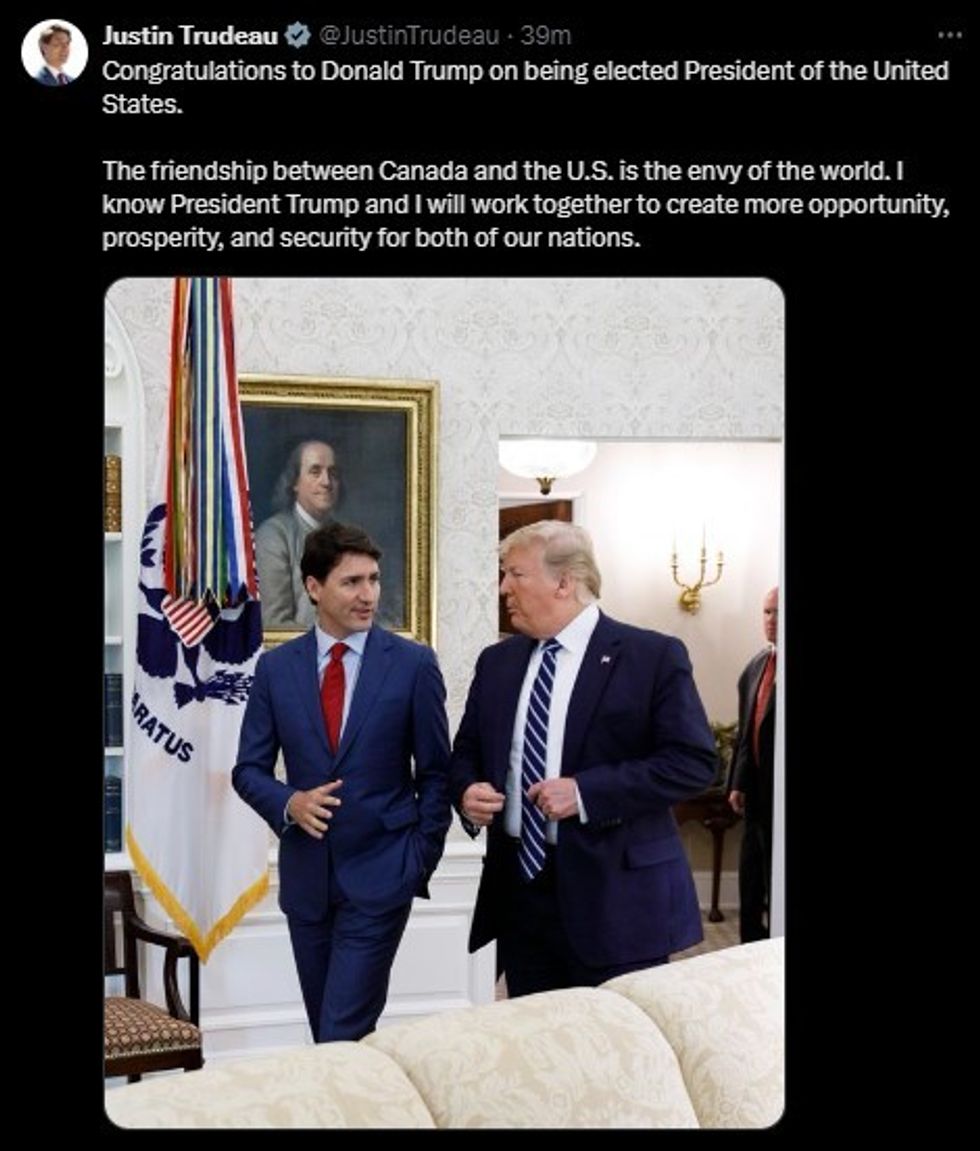 Sharing a photo of the two leaders from Trump's previous term on X, Trudeau remarked, "The friendship between Canada and the U.S. is the envy of the world."