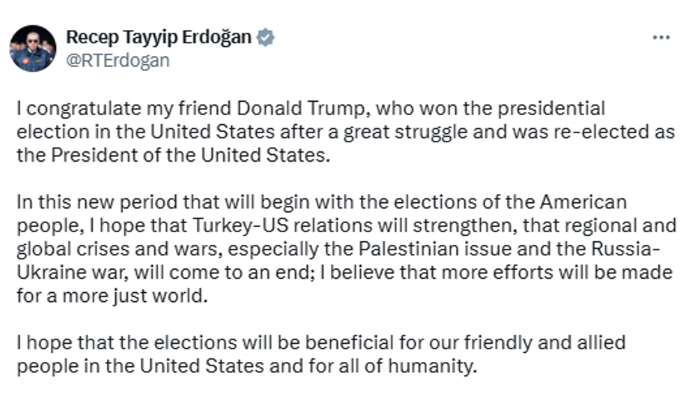 "I believe...more efforts will be given for a fairer world in this new era that began with the election by American people," Erdogan said in a post on X, adding he hoped regional wars would come to an end.