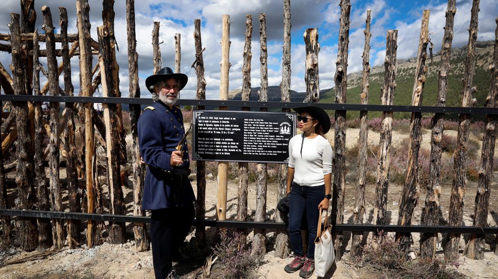Garbed in a Union officer's uniform, Sergio Garcia, a founding member of the Sad Hill Cultural Association, unveiled a plaque commemorating the hundreds of local extras who partook in the original production. At the cemetery, a man stood in a ready-to-draw pose as his portable speaker blared Ennio Morricone's "Ecstasy of Gold" earworm from the film's unforgettable score.